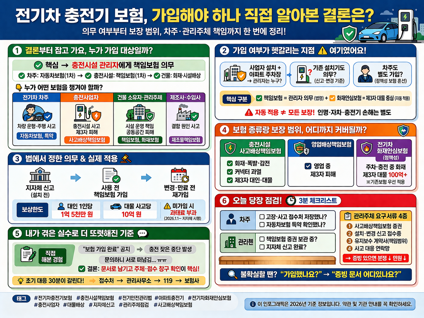 핵심정보는 전기차 충전시설 관리자에게 가입 의무가 걸린다는 점이에요. 현장에서는 충전사업자와 건물주·관리주체의 계약 구조에 따라 주체가 달라질 수 있어요.