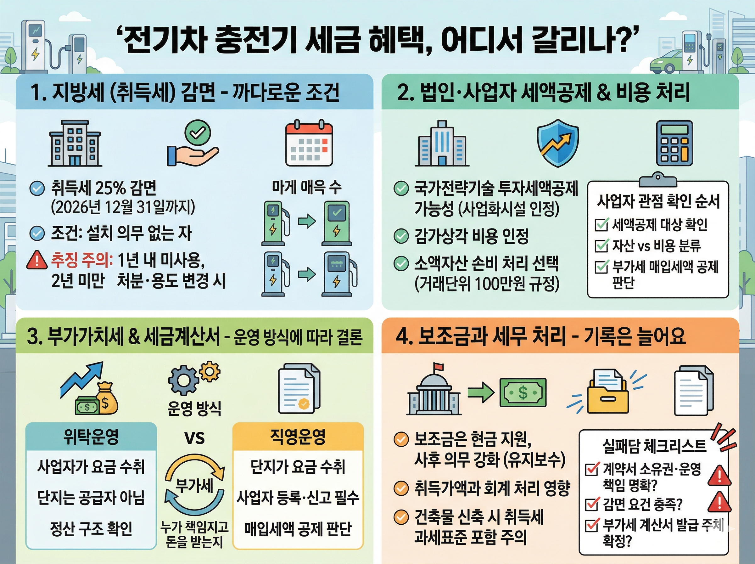 전기차 충전기 세금 혜택은 이야기만 들으면 많아 보여요. 근데 정리해보면 세 갈래로 나뉘어요. 첫째는 지방세 쪽, 특히 취득세 감면이에요. 둘째는 법인·사업자 세무 쪽이라서 감가상각, 비용처리, 투자세액공제 같은 영역이에요. 셋째는 부가세와 세금계산서 문제인데, 충전요금을 받는 구조가 걸리면 여기서 머리가 아파져요.