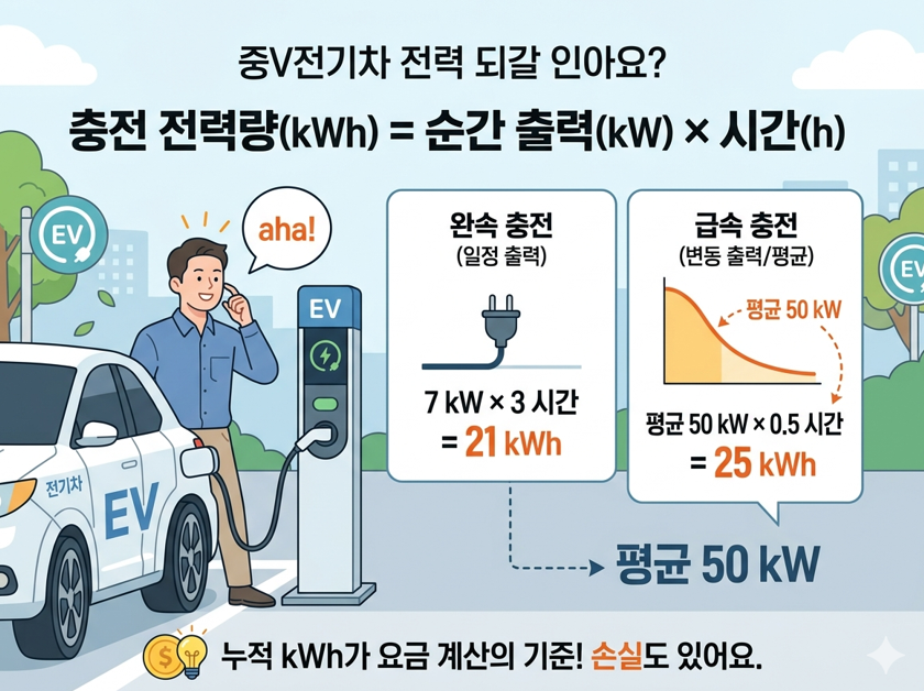 계산을 10초로 줄이는 요령이 있어요. 충전기나 앱에 “세션 kWh”가 찍히면 그 숫자를 그대로 쓰고, 없으면 평균 출력부터 만들면 돼요. 평균 kW는 kWh ÷ 시간이라서, 분을 시간으로 바꾸는 것만 하면 끝나죠. 뭐 어차피 급속은 순간 kW가 요동치니까 평균이 가장 현실적이에요.