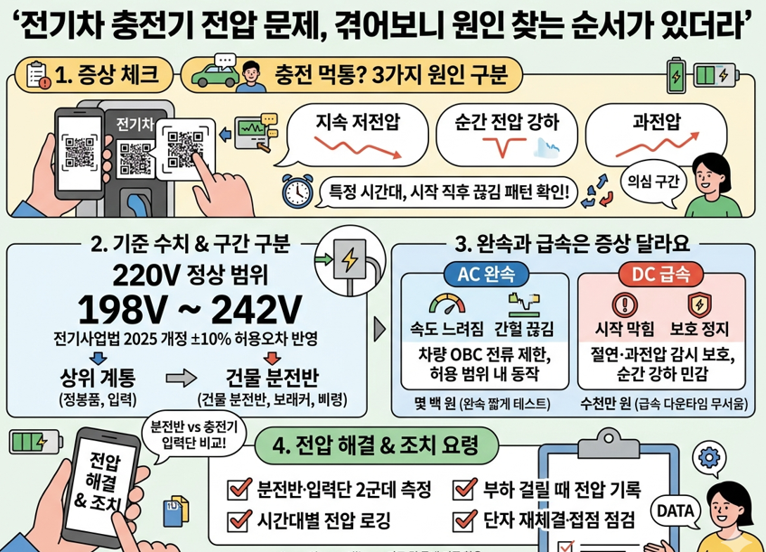 충전기 화면에 ‘저전압’ ‘과전압’ 비슷한 문구가 뜨면, 마음이 확 급해져요. 충전기 고장인가 싶어서 고객센터부터 찾게 되죠. 근데 전압 문제는 충전기 자체보다 전기 공급 조건에서 시작되는 경우가 많더라고요. 10분만 잡아도 원인 범위를 절반으로 줄일 수 있어서 더 아까워요.